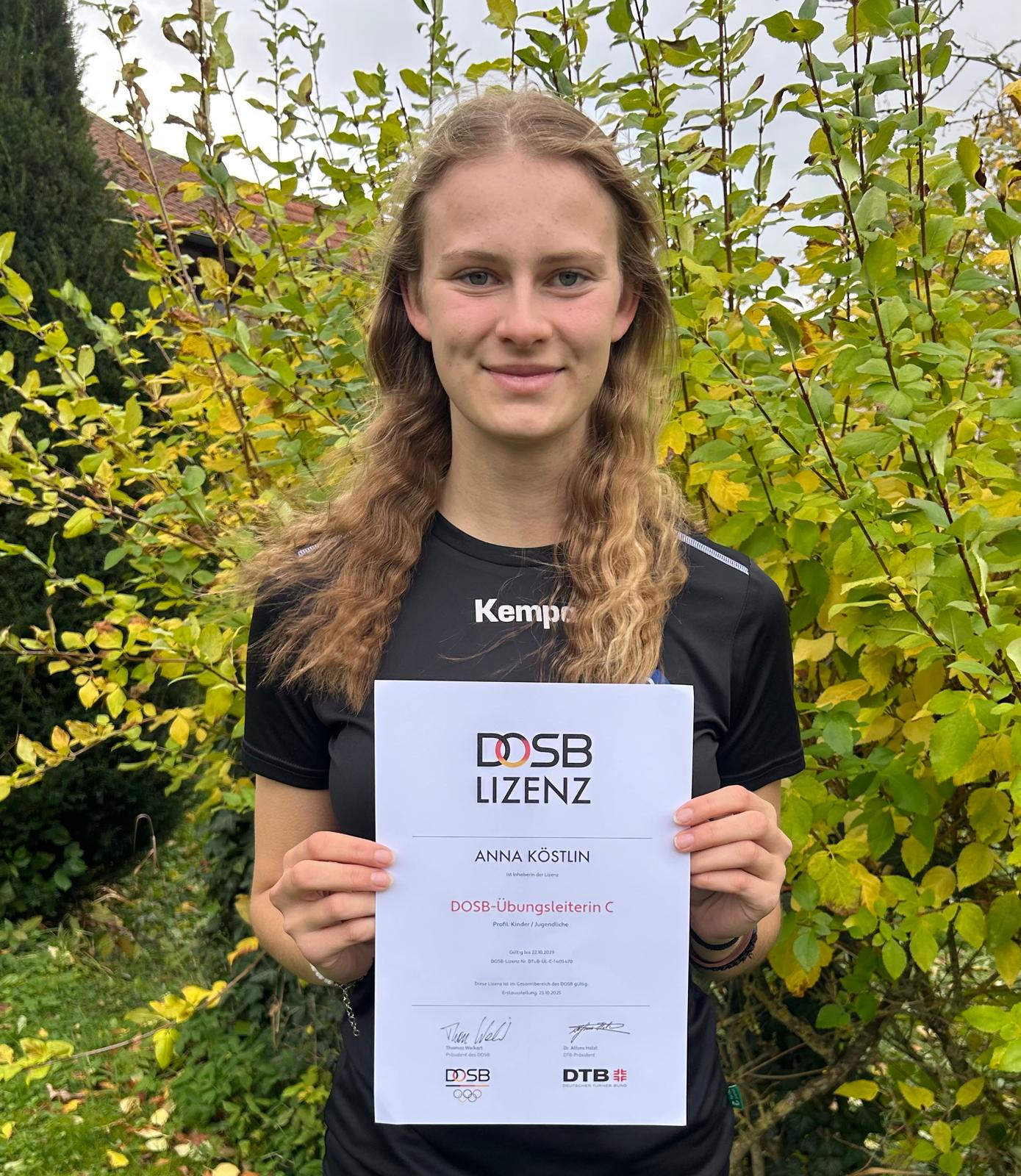 n Anna Köstlin herzlich zu einer besonderen Leistung gratulieren: Sie hat die Prüfung zur staatlich anerkannten nebenberuflichen Übungsleiterin C Breitensport mit dem Profil Kinder/Jugendliche erfolgreich bestanden. Mit dem Erwerb dieser Qualifikation verstärkt Anna unser Übungsleiterteam als weitere lizenzierte Übungsleiterin aus den eigenen Reihen. Dies ist ein bedeutender Schritt sowohl für sie persönlich als auch für unser gesamtes Team. Herzlichen Glückwunsch, Anna, zu diesem tollen Erfolg!