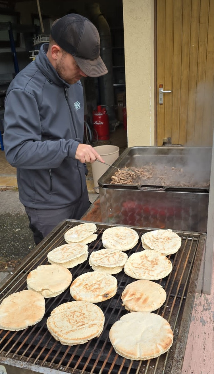 Also eine wichtige Aufgabe, um die Qualität des Platzes zu erhalten. Der Sand wurde daher sowohl längs als auch quer auf dem Platz verteilt und direkt nach dem Aufbringen in die vorhandenen Unebenheiten geschoben. Diese körperlich anstrengende Arbeit forderte alle Beteiligten – Jung und Alt – gleichermaßen. Den Abschluss des arbeitsreichen Tages bildete ein gemeinsames Essen. Zur Belohnung gab es für alle Helfer köstliches Gyros vom Grill, zubereitet vom Chefkoch Bastian Knodel.